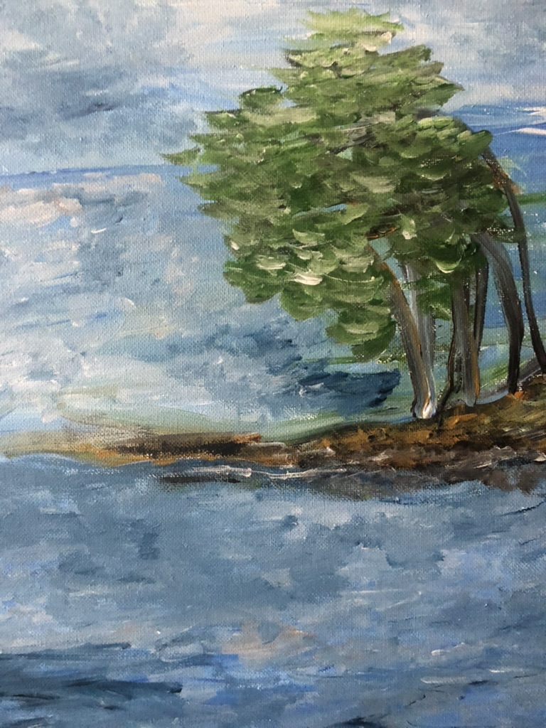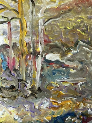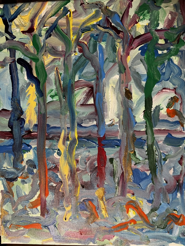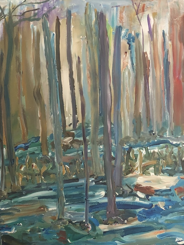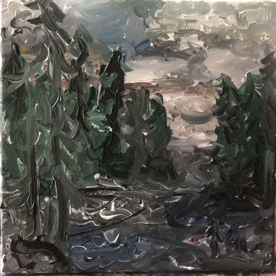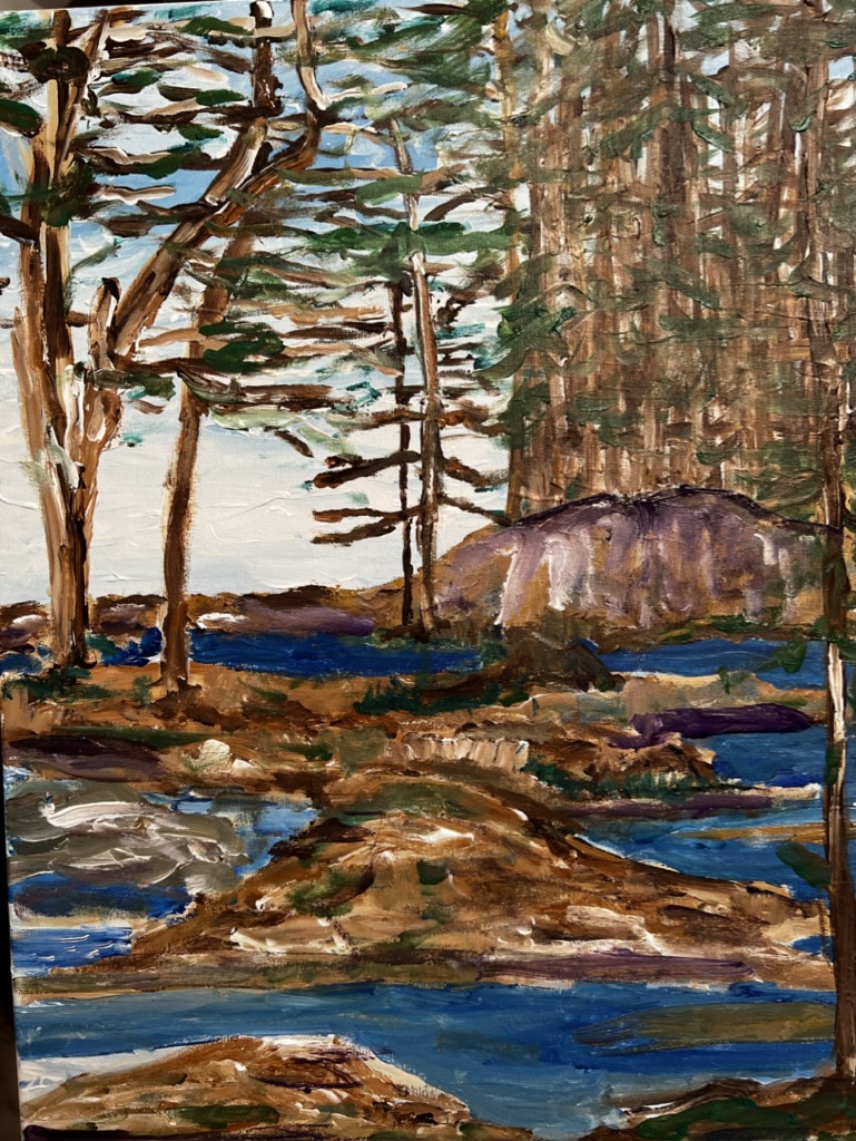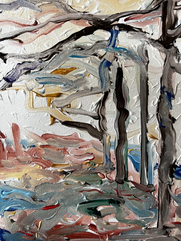 I painted for a brief spell in college. In March 2022, I awoke one morning and knew it was time to paint again. The painting was different in this new time. It was as though a new part of me had blown open, and that it was filled with color and light and shadows of my beloved northwoods of Ontario. From that first burst–in which I painted more than 100 paintings in month–I have continued to explore connection with alterity as it guides me, dares me, invites me, and teaches me about beauty, nature, perception, and creative imagination.