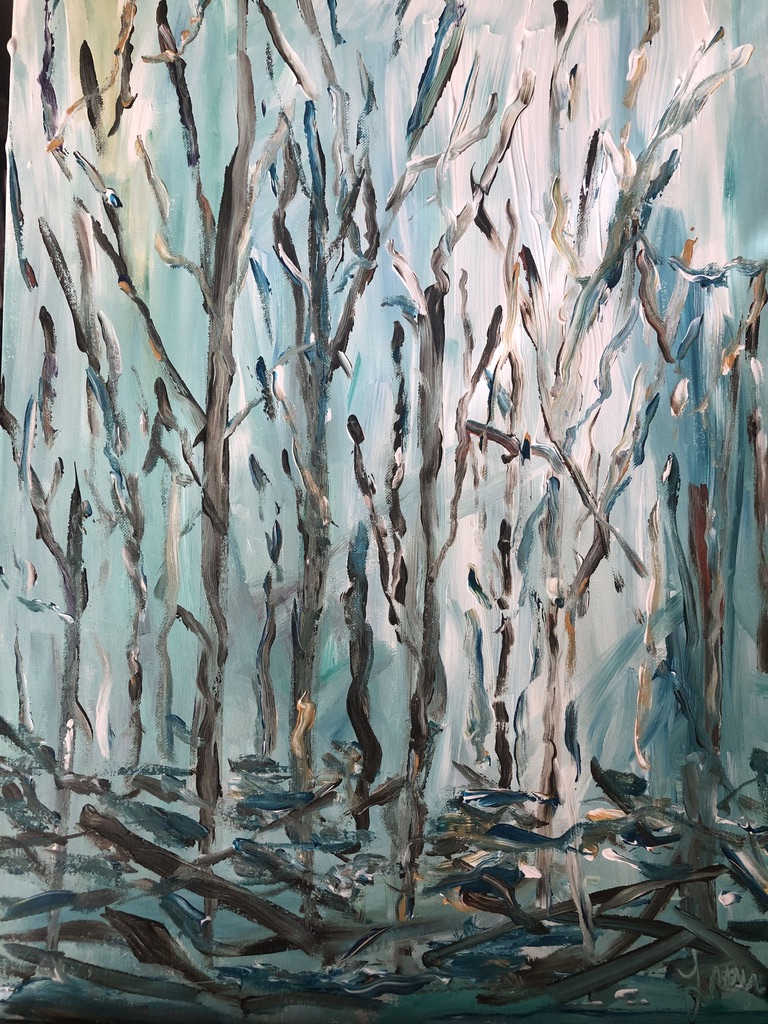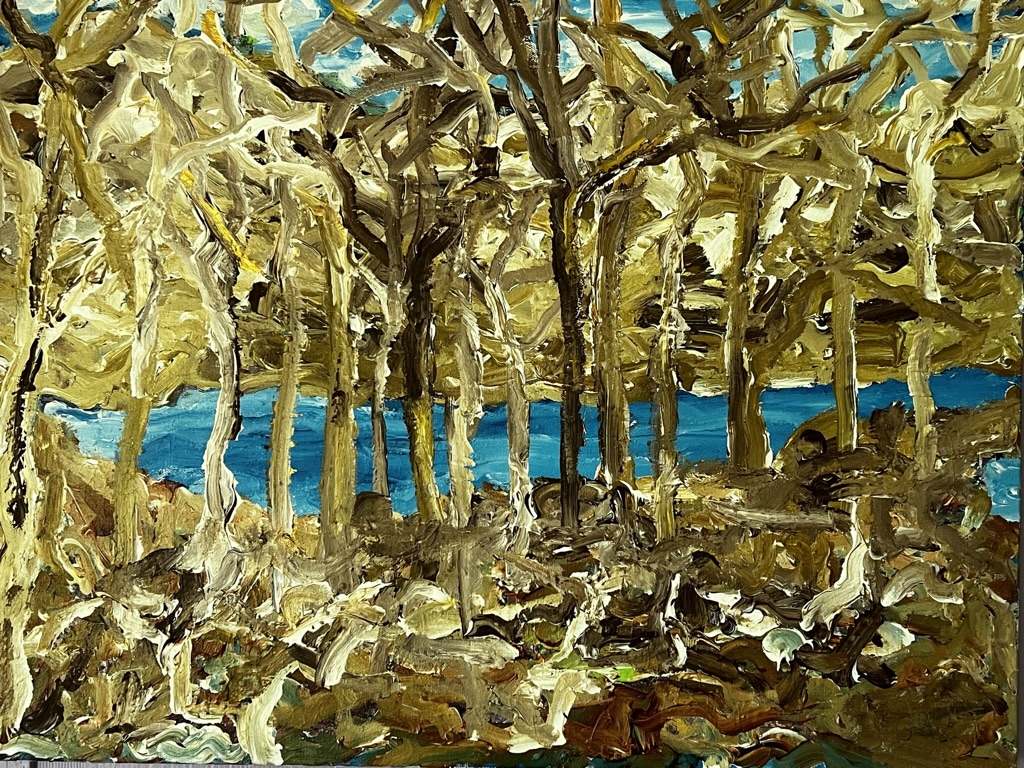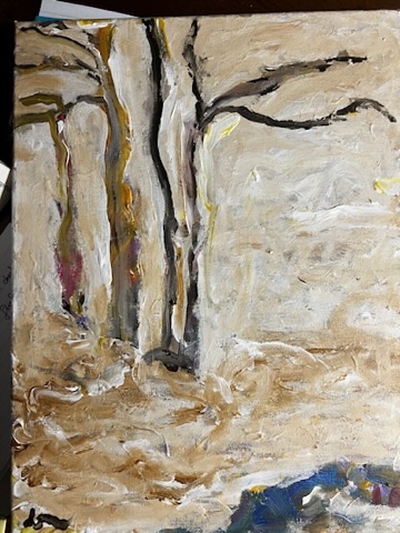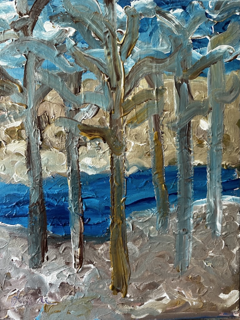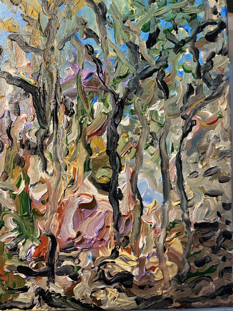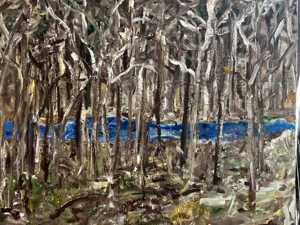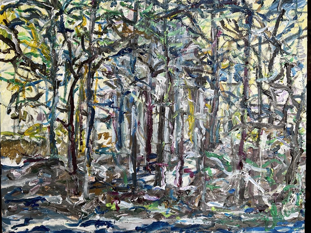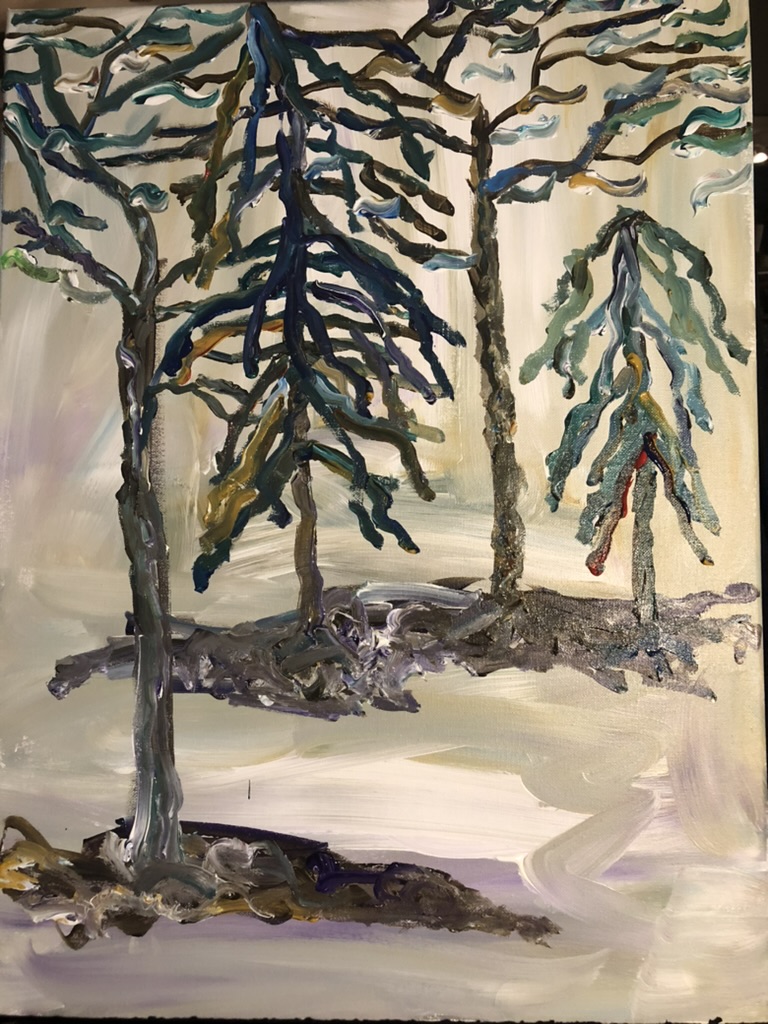 I painted for a brief spell in college. In March 2022, I awoke one morning and knew it was time to paint again. The painting was different in this new time. It was as though a new part of me had blown open, and that it was filled with color and light and shadows of my beloved northwoods of Ontario. From that first burst–in which I painted more than 100 paintings in month–I have continued to explore connection with alterity as it guides me, dares me, invites me, and teaches me about beauty, nature, perception, and creative imagination.