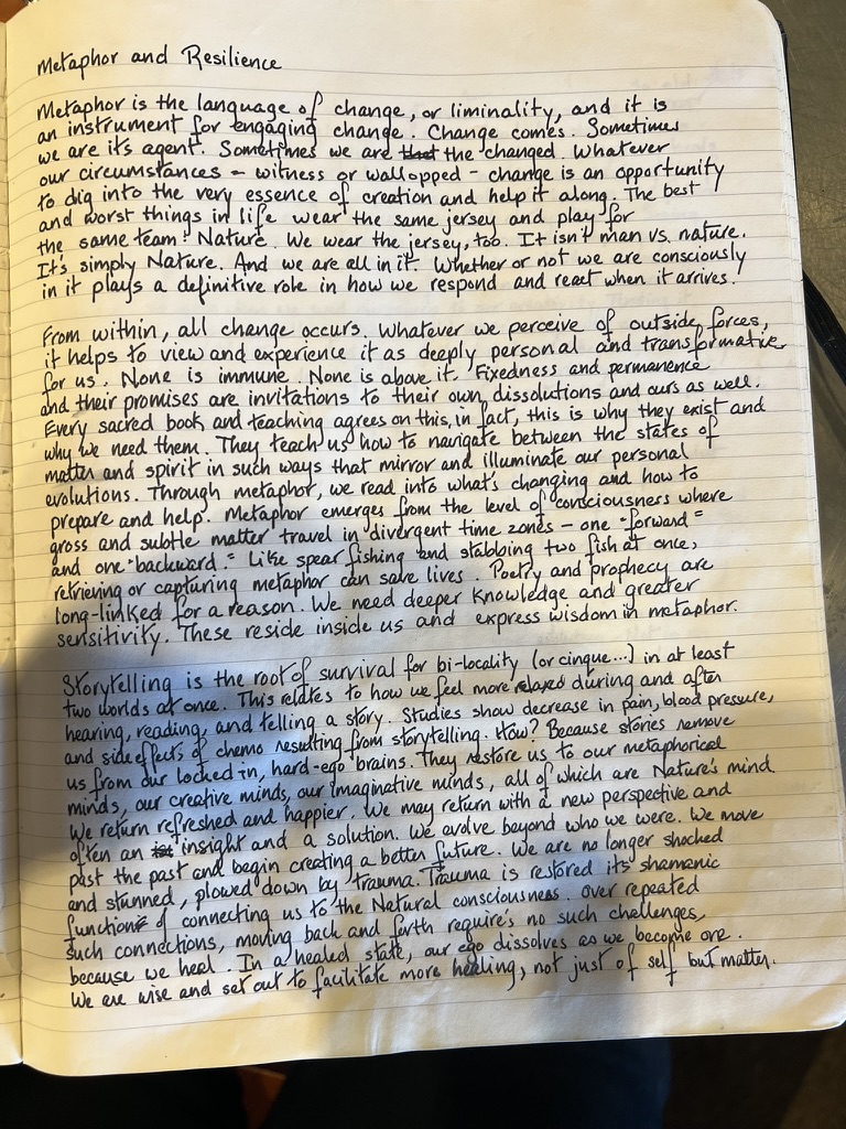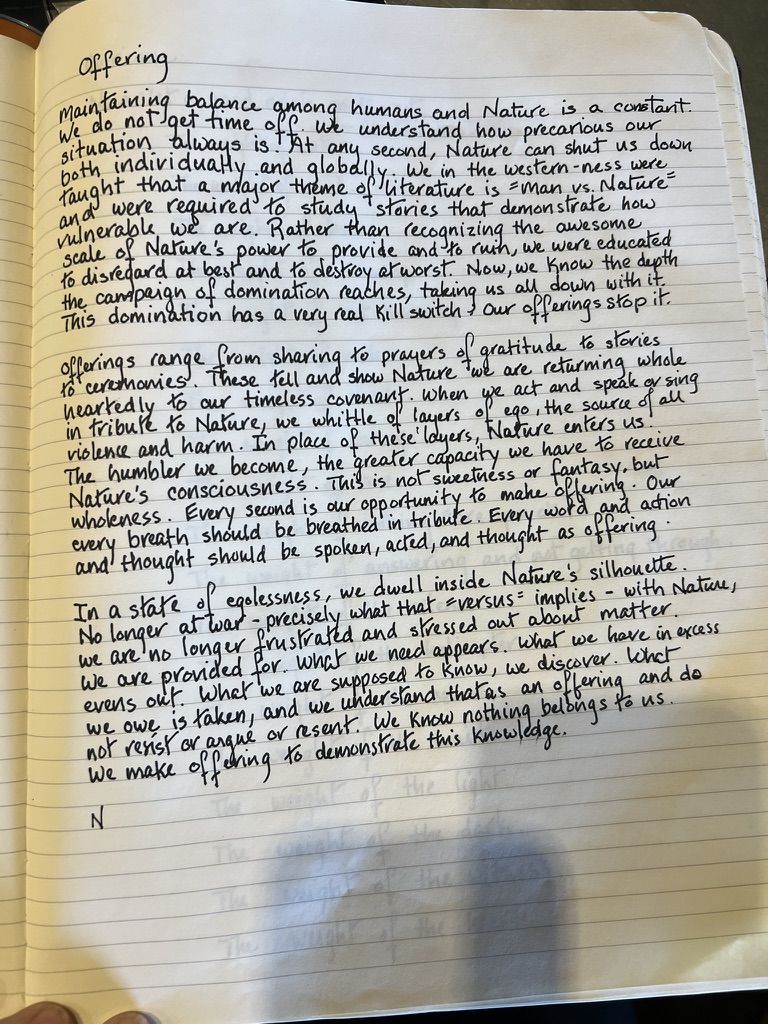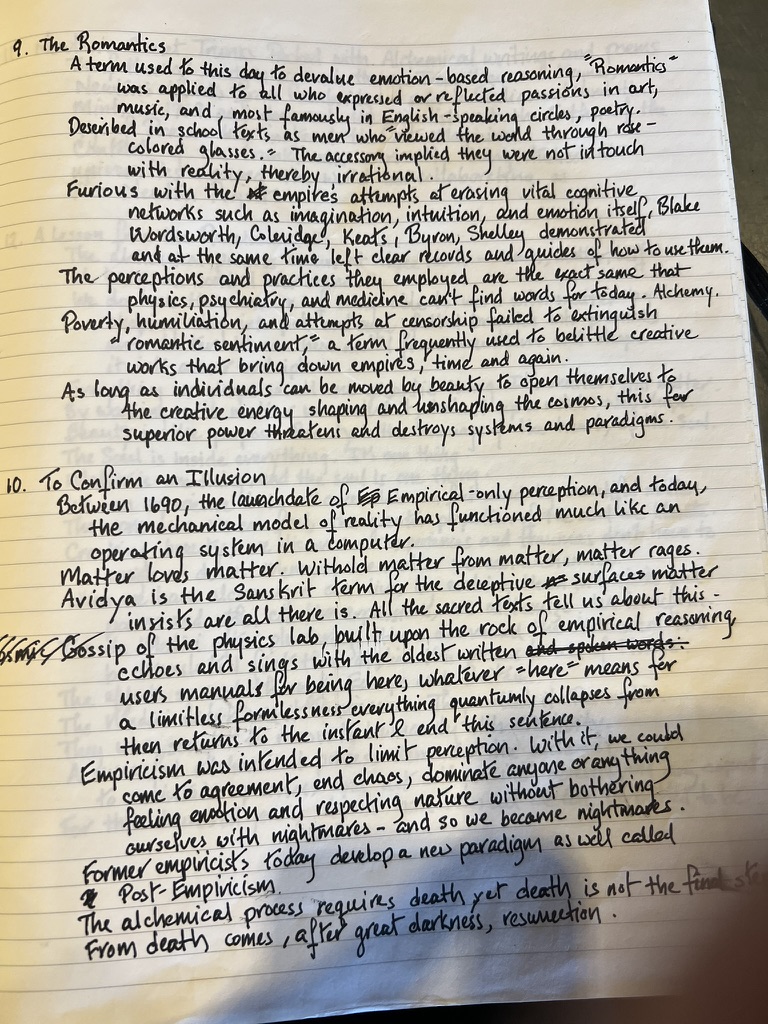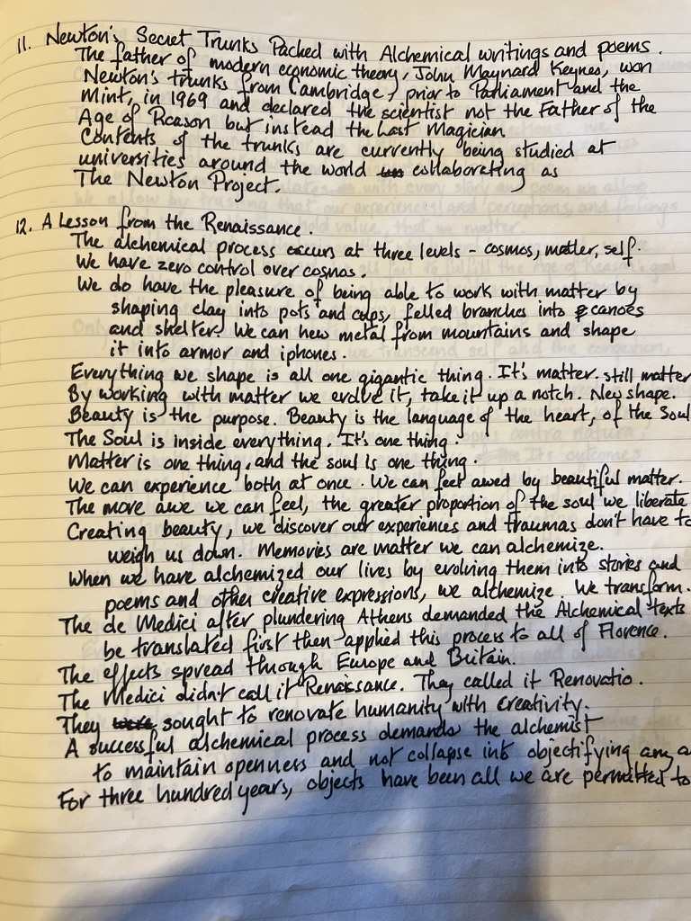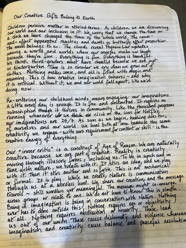 Between November 2022 and April 2023, I experienced a traumatic brain injury that developed into “post-concussive syndrome” comprised of acute photophobia, impaired cognition, lack of sensory discernment, and excrutiation, unceasing pain. As I emerged, I wrote more than 100,000 words in six months on a Substack (Laura Hope-Gill ‘s Quiet World). I was translating the months of non-thought into words from a very deep place within, a place I had inhabited. Here are some of the handwritten pages. Prior to the injury, my handwriting was scrawl. These, as you see, are extremely tidy printing. All of these notes and essays present concepts of Natural Philosophy, as though the intuitive writing were notifying me of my new, integrated mind.